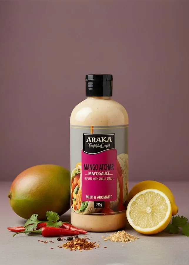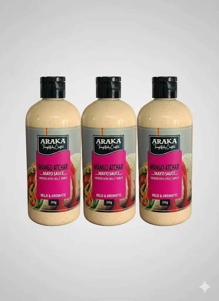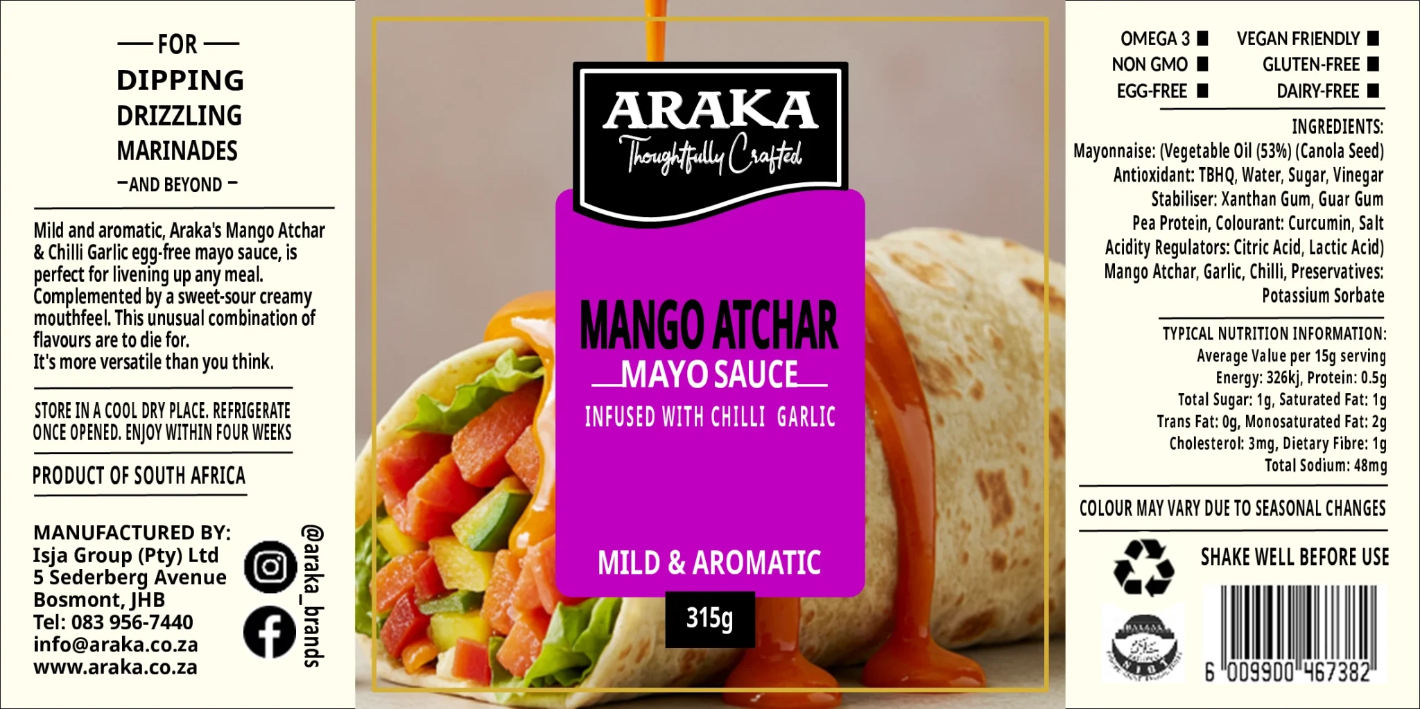 Mild and aromatic, Araka’s Mango Atchar & Chilli Garlic egg-free mayo sauce, is perfect for livening up any meal. Complemented by a sweet-sour creamy mouthfeel. This unusual combination of flavours are to die for. It’s more versatile than you think. It’s perfect for dipping fries and savouries.